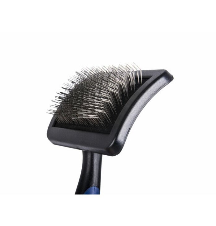 Deze borstel is vervaardigd uit schokvrij, ABS plastiek en heeft een antislip handvat. Uniek design met hoekige lange en korte tanden. Klassiek ontwerp met gebogen rug om de meest hardnekkige klitten te verwijderen, en dit op de moeilijkste plaatsen.